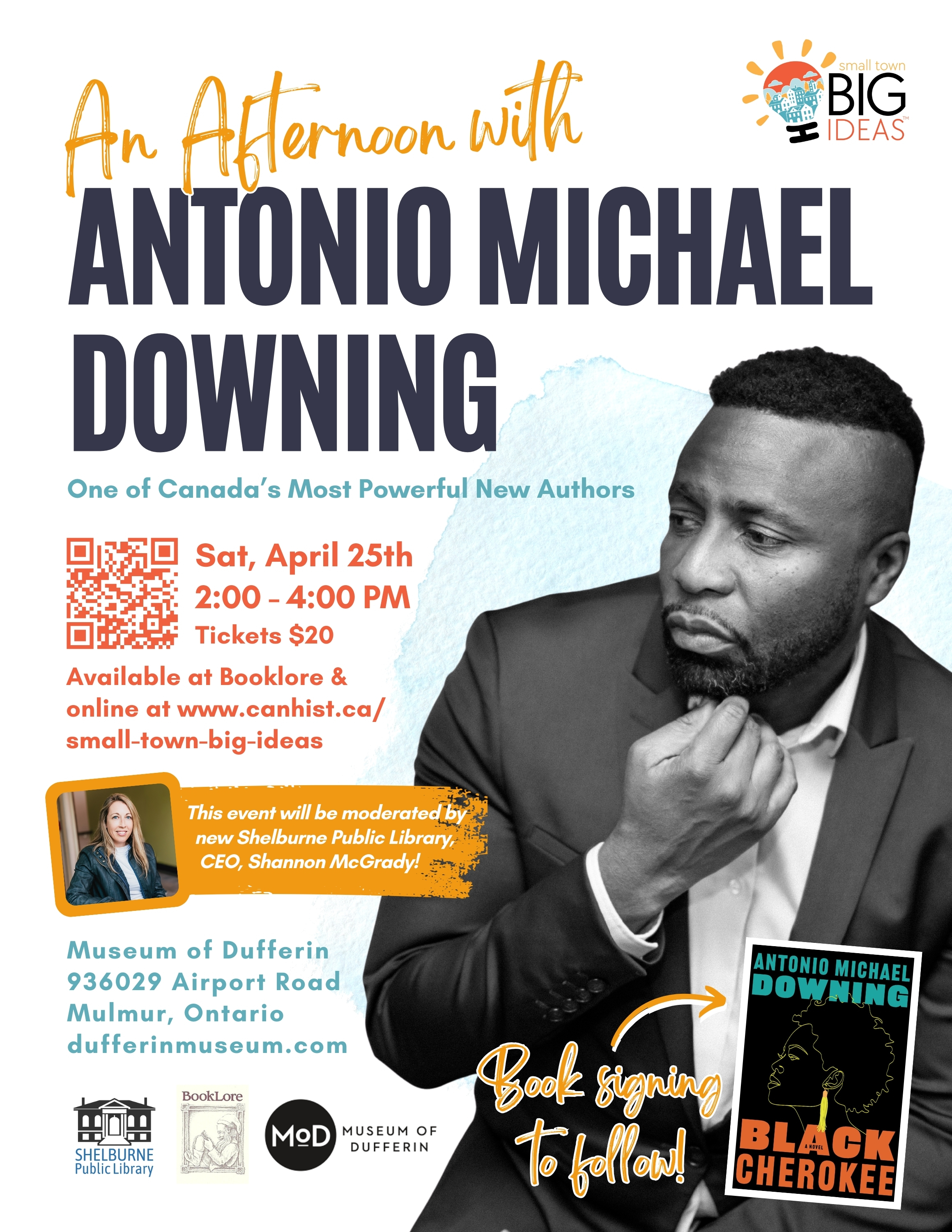 The Town of Shelburne is pleased to help share an exciting event taking place later this month. In partnership with the Museum of Dufferin, BookLore, and Small Town Big Ideas, acclaimed Canadian author Antonio Michael Downing will be visiting on Saturday, April 25, 2026, for an afternoon of conversation, storytelling, and literary insight.