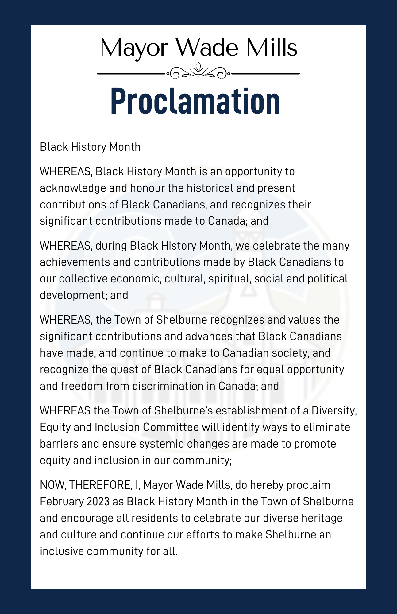 Mayor Wade Mills, on behalf of the Council of the Town of Shelburne, proclaims February 2023 as Black History Month in the Town of Shelburne.