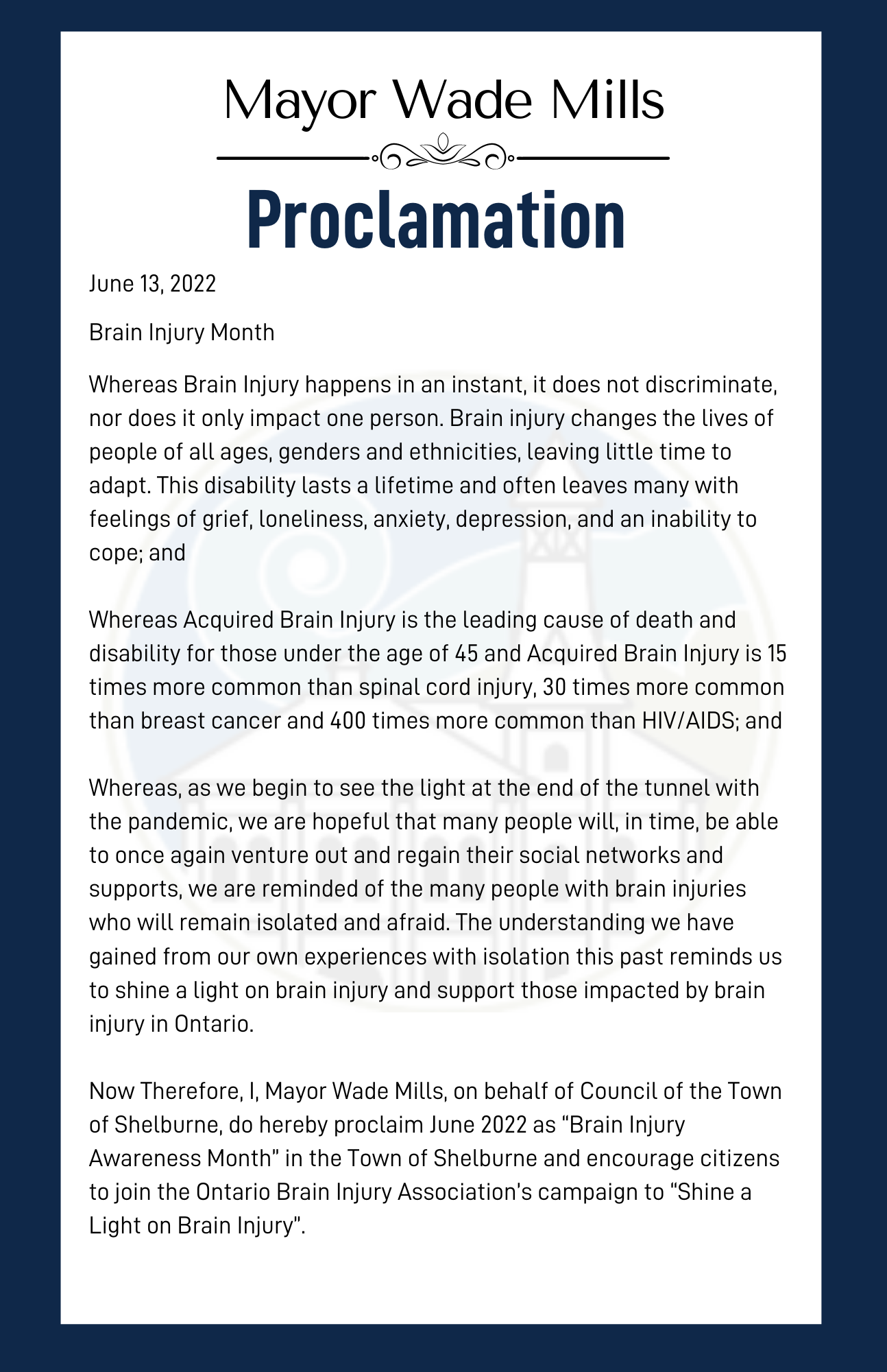 Now Therefore, I, Mayor Wade Mills, on behalf of Council of the Town of Shelburne, do hereby proclaim June 2022 as “Brain Injury Awareness Month” in the Town of Shelburne and encourage citizens to join the Ontario Brain Injury Association’s campaign to “Shine a Light on Brain Injury”.
