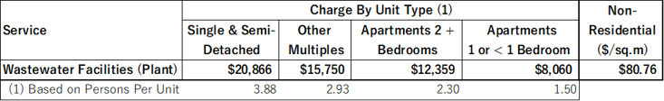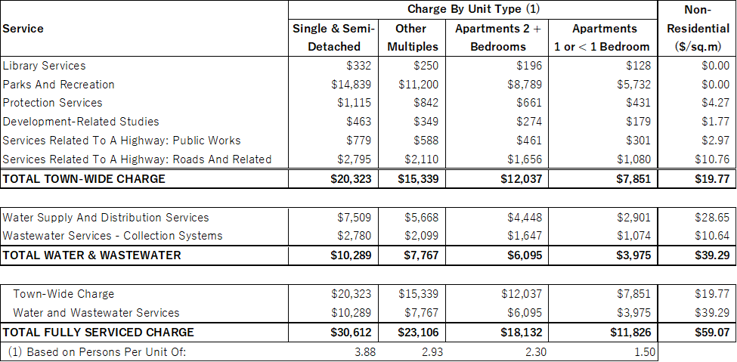 Town-wide development charges are levied against new development to pay for the increased capital costs related to the provision of such municipal services as: Library Services, Parks and Recreation, Protection Services, Development-Related Studies, Services Related to a Highway (Public Works and Roads and Related), Water Supply and Distribution Services, and Wastewater Services (Collection, Plant, and Financing if applicable).