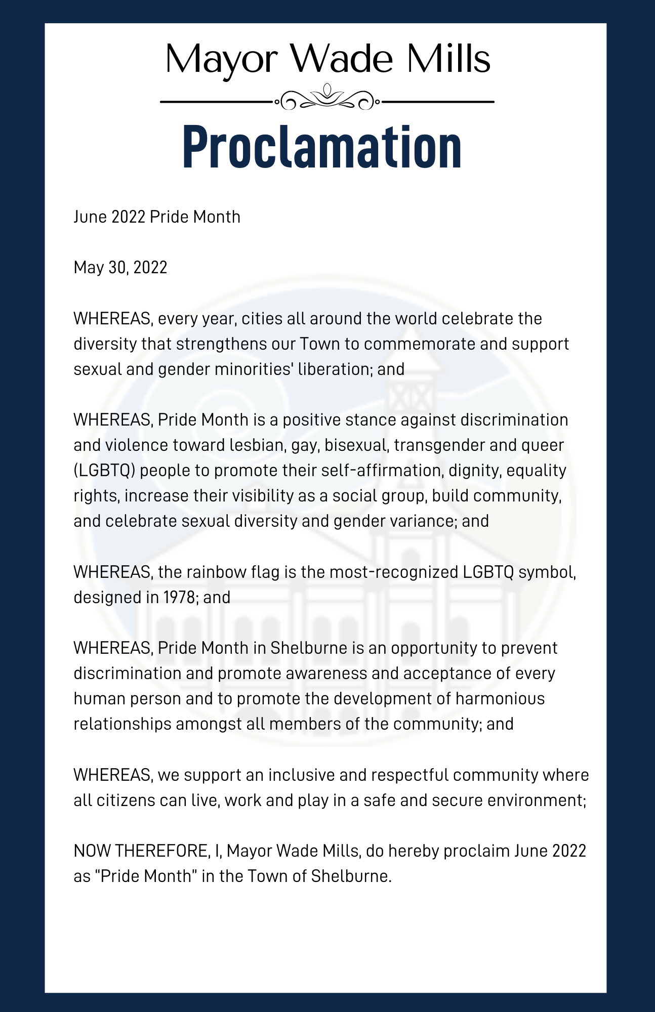 NOW THEREFORE, I, Mayor Wade Mills, do hereby proclaim June 2022 as “Pride Month” in the Town of Shelburne.