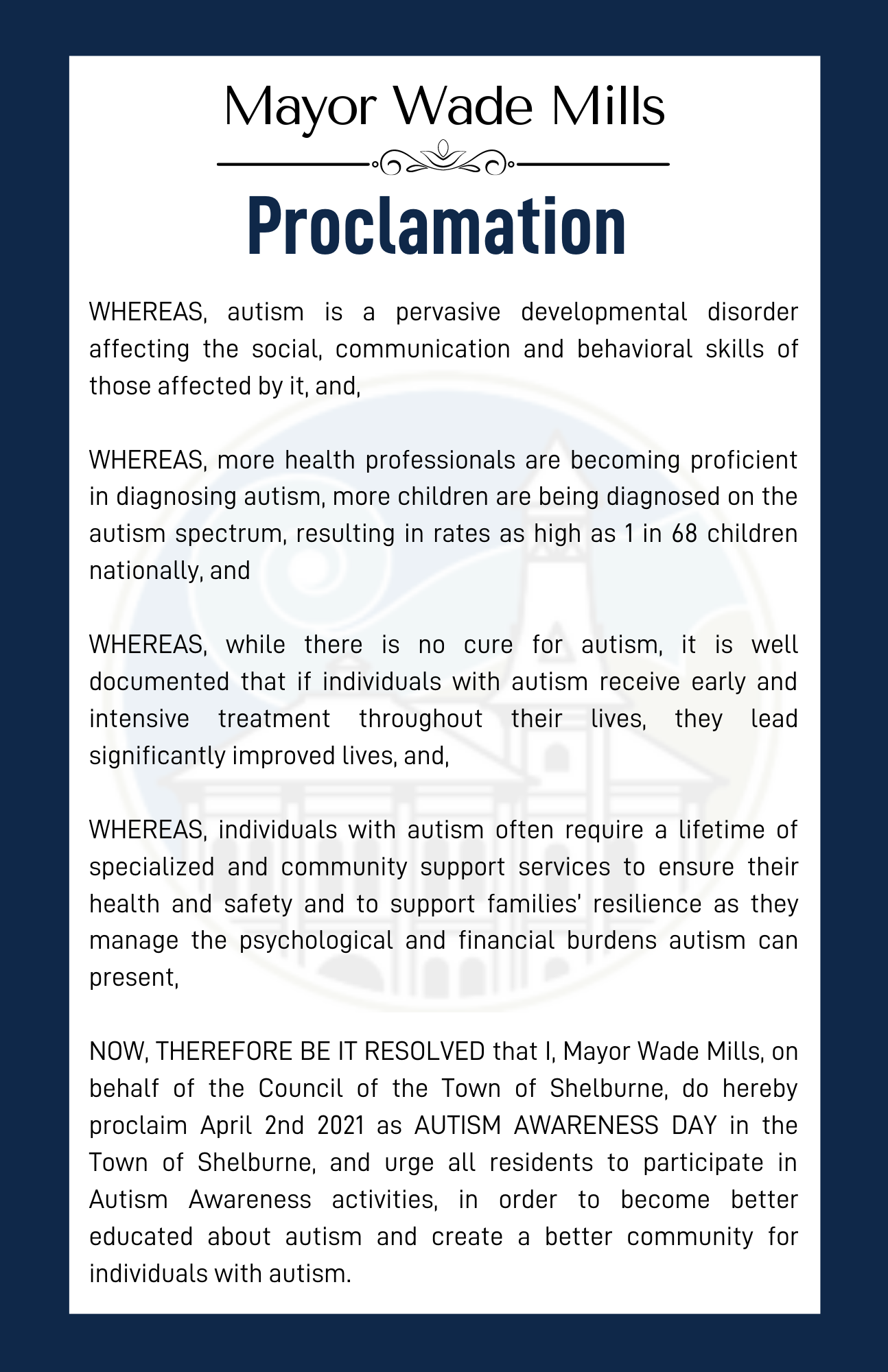 Mayor Wade Mills, on behalf of the Council of the Town of Shelburne, do hereby proclaim April 2nd 2021 as AUTISM AWARENESS DAY in the Town of Shelburne, and urge all residents to participate in Autism Awareness activities, in order to become better educated about autism and create a better community for individuals with autism.