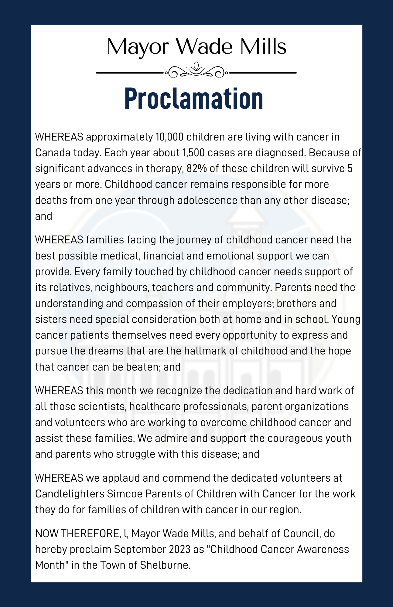 NOW THEREFORE, l, Mayor Wade Mills, and behalf of Council, do hereby proclaim September 2023 as "Childhood Cancer Awareness Month" in the Town of Shelburne.