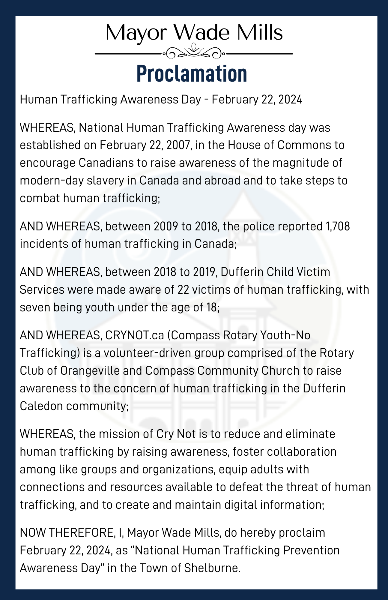 NOW THEREFORE, I, Mayor Wade Mills, do hereby proclaim February 22, 2024, as “National Human Trafficking Prevention Awareness Day” in the Town of Shelburne.