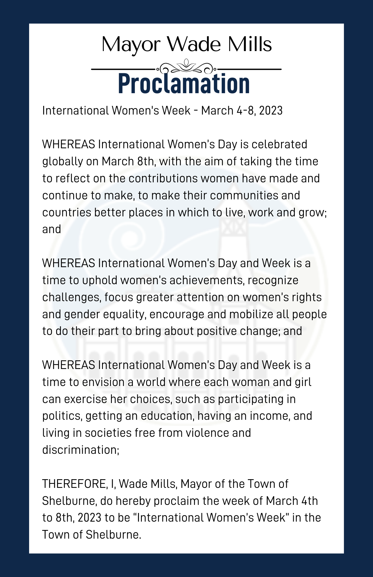 THEREFORE, I, Wade Mills, Mayor of the Town of Shelburne, do hereby proclaim the week of March 4th to 8th, 2023 to be “International Women’s Week” in the Town of Shelburne.