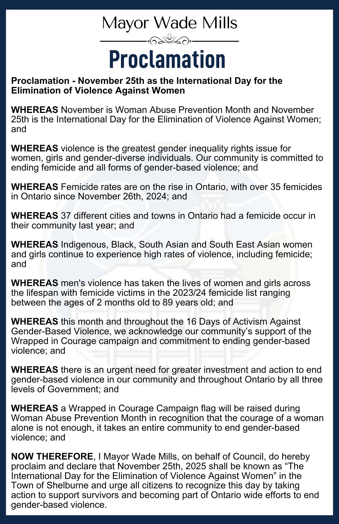 NOW THEREFORE, I Mayor Wade Mills, on behalf of Council, do hereby proclaim and declare that November 25th, 2025 shall be known as “The International Day for the Elimination of Violence Against Women” in the Town of Shelburne and urge all citizens to recognize this day by taking action to support survivors and becoming part of Ontario wide efforts to end gender-based violence.