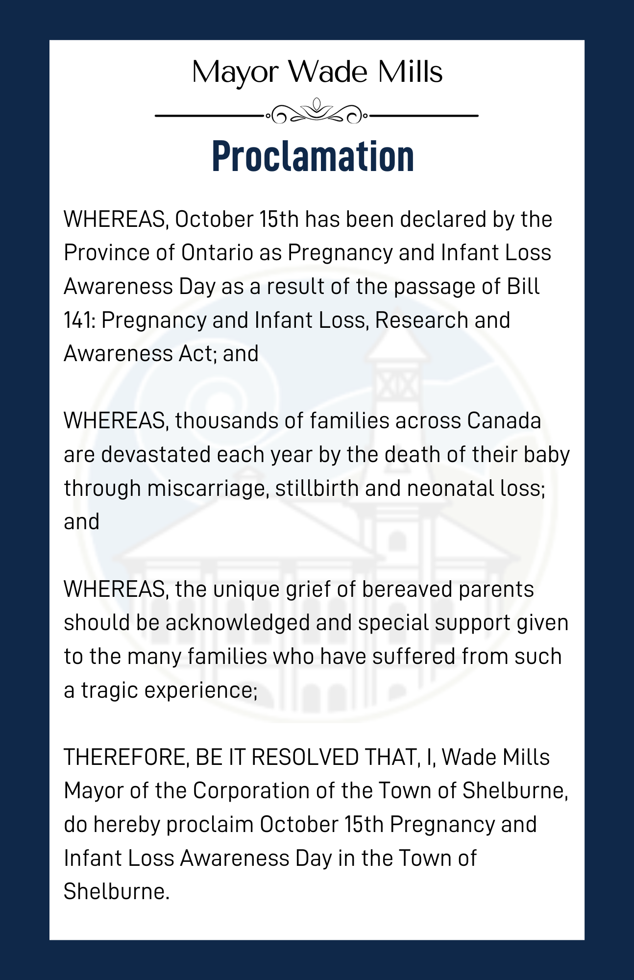 THEREFORE, BE IT RESOLVED THAT, I, Wade Mills Mayor of the Corporation of the Town of Shelburne, do hereby proclaim October 15th Pregnancy and Infant Loss Awareness Day in the Town of Shelburne.