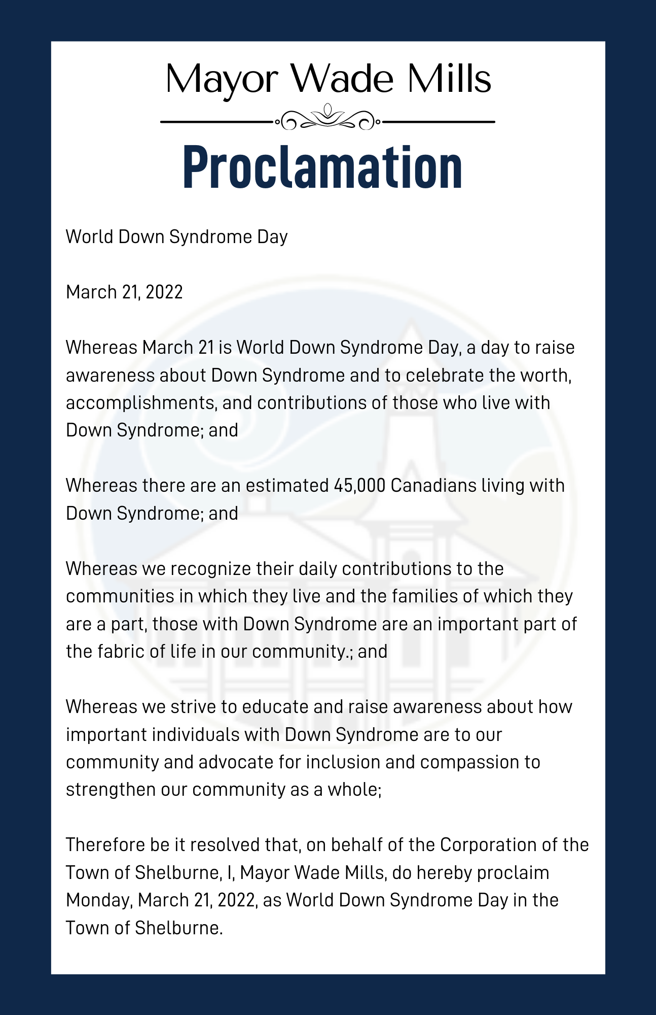 Therefore be it resolved that, on behalf of the Corporation of the Town of Shelburne, I, Mayor Wade Mills, do hereby proclaim Monday, March 21, 2022, as World Down Syndrome Day in the Town of Shelburne.